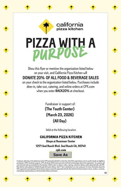 Pizza With A Purpose - Help The Youth Center.On Monday, March 23rd, California Pizza Kitchen will be giving 20% of your food bill back to The Youth Center all day. You can grab a terrific salad for lunch and then have a terrific BBQ Chicken