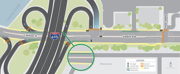 - Installation of a new traffic signal at the northbound I-605/Katella Avenue off-ramp, along with upgraded signals at nearby intersections